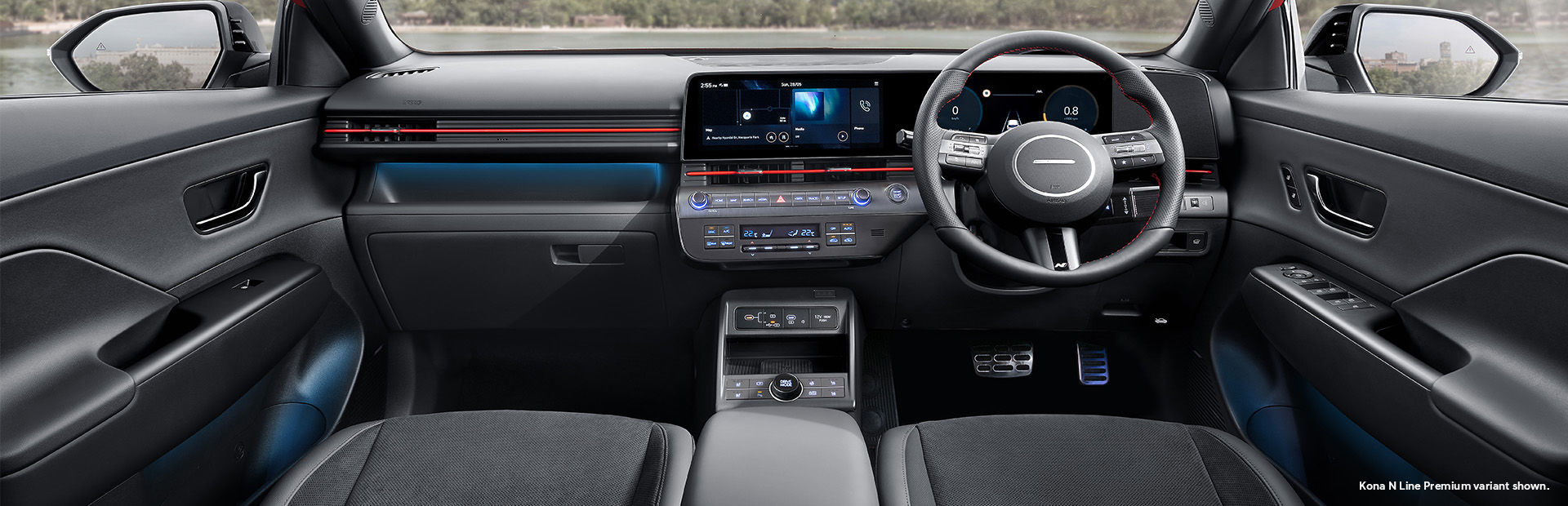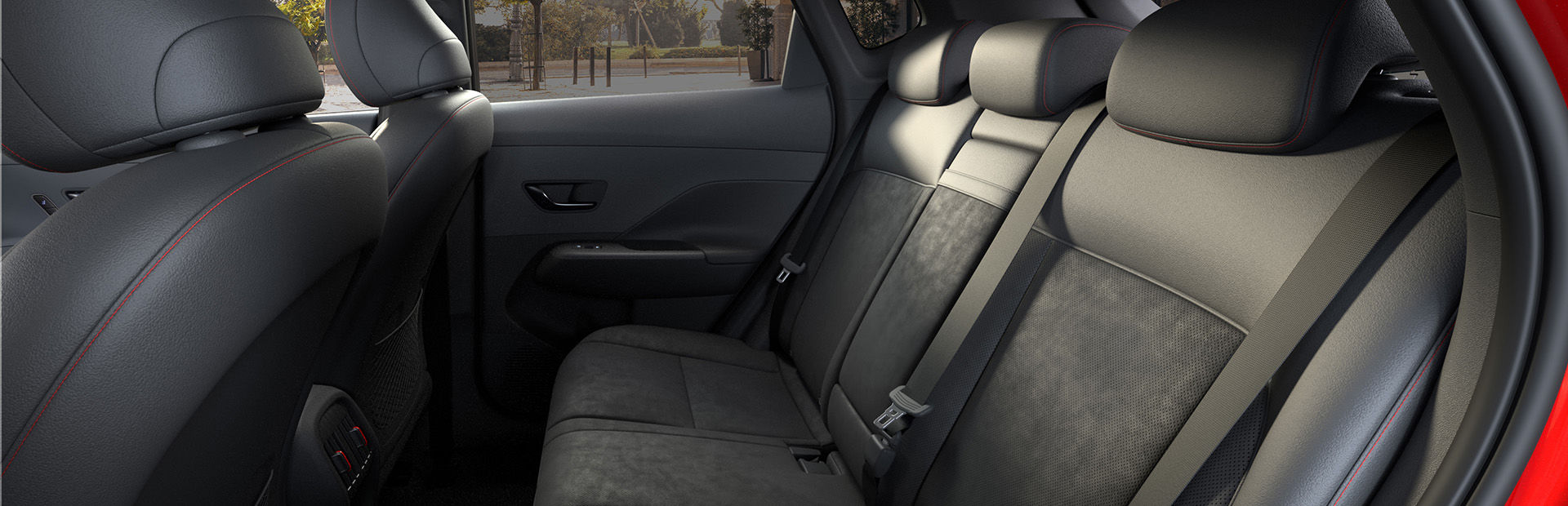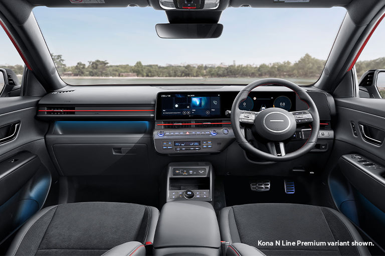 Step inside the Hyundai KONA N Line and discover an interior that is pure sports sophistication. N Line exclusive leather appointed[P5] Alcantara® seats, active red highlights and N Line signature accents combine to create an exhilarating driving environment.